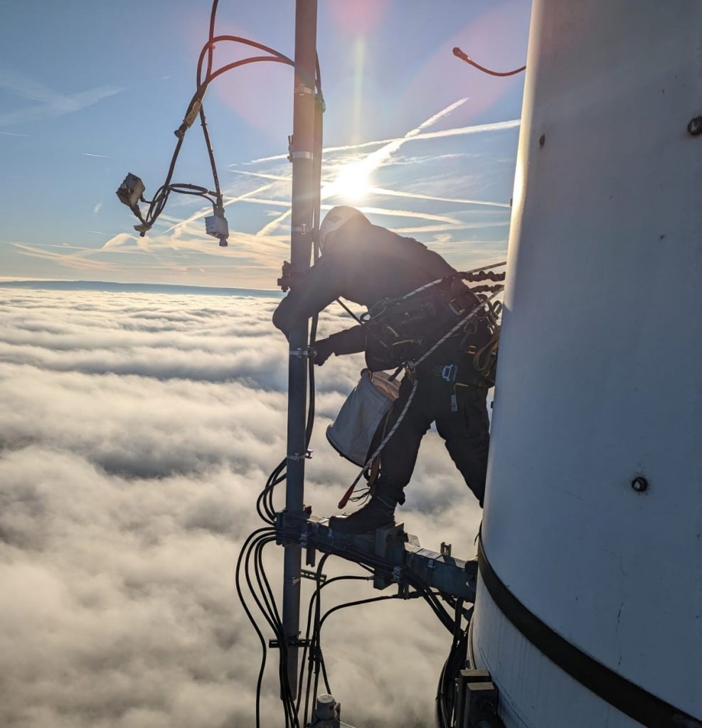 Professionelle Installation und Wartung von Mobilfunkanlagen in großer Höhe.
